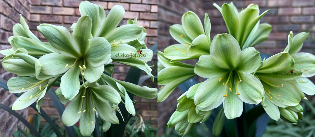 Two of our outstanding Charles Green F2 recovered seedlings out of our Clivias4africa Stargreen line breeding. Our whimsical Fiona, Queen of Green, on a level of her own, crossed with VeriGreen, how green can you go?