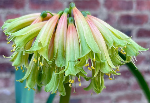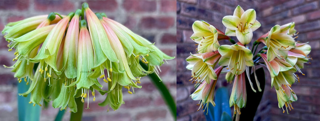 Fairy Green features soft salmon coloured bases, flowing into bright green flower tips, giving a fresh look, crossed with the multicoloured Oriental Star - known for its full head, dark magenta versi, and bold green stripes, this pairing whispers a striking and highly desirable clivia for any collection.